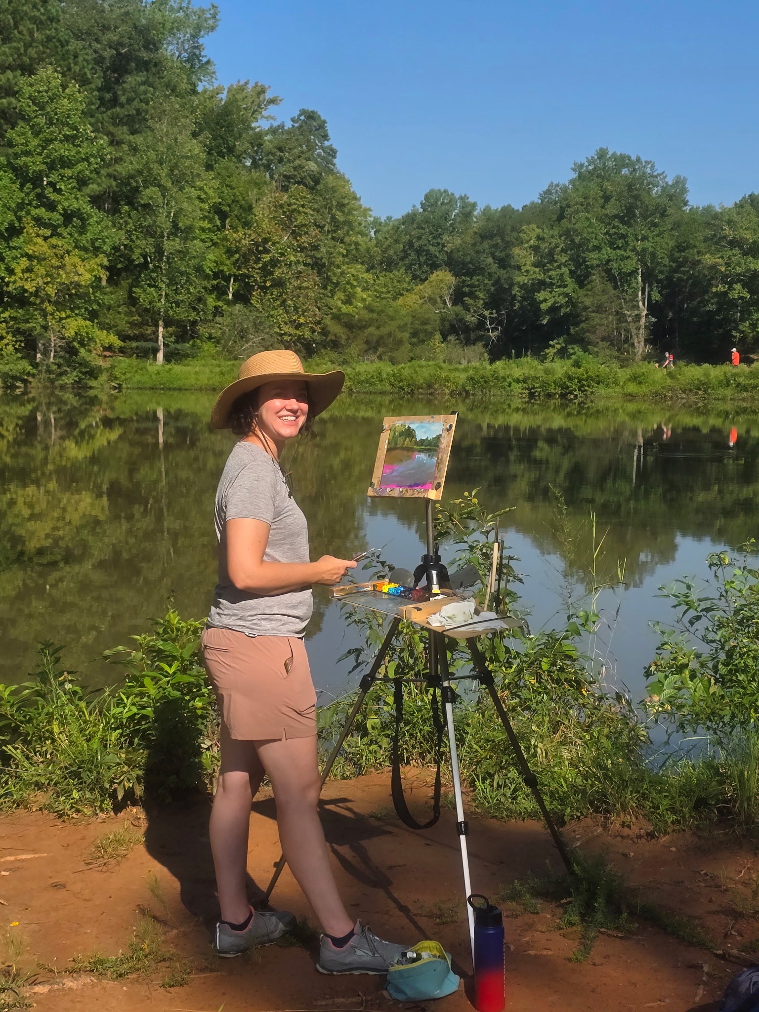 My typical palette includes ultramarine, cerulean, permanent rose, magenta, cadmium yellow, lemon yellow, burnt sienna, raw umber, and white, with occasional additions of teal, Payne’s gray, Indian yellow, or viridian. Whether I’m painting locally in Charlotte’s parks, greenways, and waterways or arranging still life compositions that juxtapose natural and man-made forms, I seek to translate color into emotion.